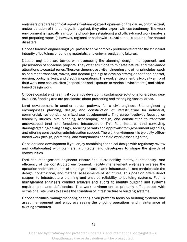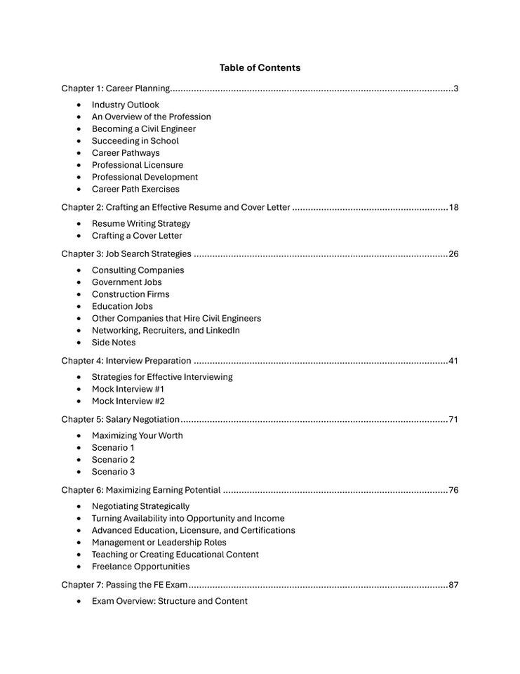 This handbook is tailored to provide career guidance specific to the civil engineering occupation, and focuses on helping professionals navigate the unique challenges of the industry. It includes proven study strategies and 30+ sample questions for the FE and PE exams. Whether you're launching your career, navigating a professional pivot, looking to boost your income, or aiming for your next promotion, this handbook empowers you to reach your full career potential. Perfect for ambitious individuals ready to take control of their careers. This handbook is organized into several key chapters.